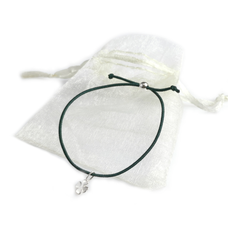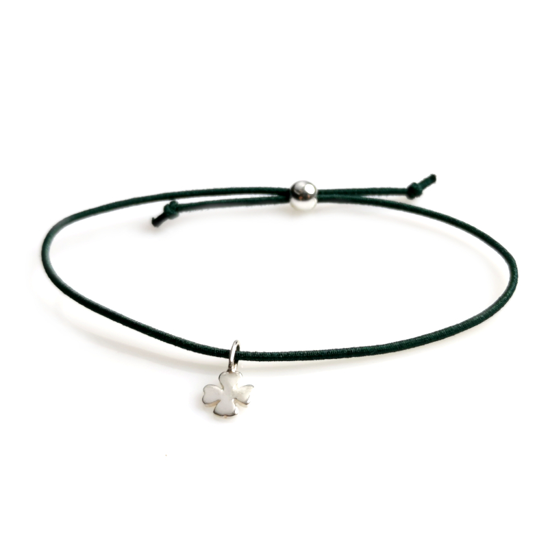 Kleeblatt Anhänger. Das Armband ist aus elastischem schwarzem Schmuckgummi handgefertigt.