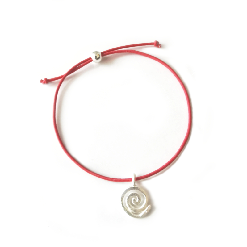 Glücksarmband HAPPY CHARMS ziert ein 925 Sterling Silber Anhänger in Form einer Spirale. Das Armband ist aus rotem elastischem Schmuckgummi handgefertigt.