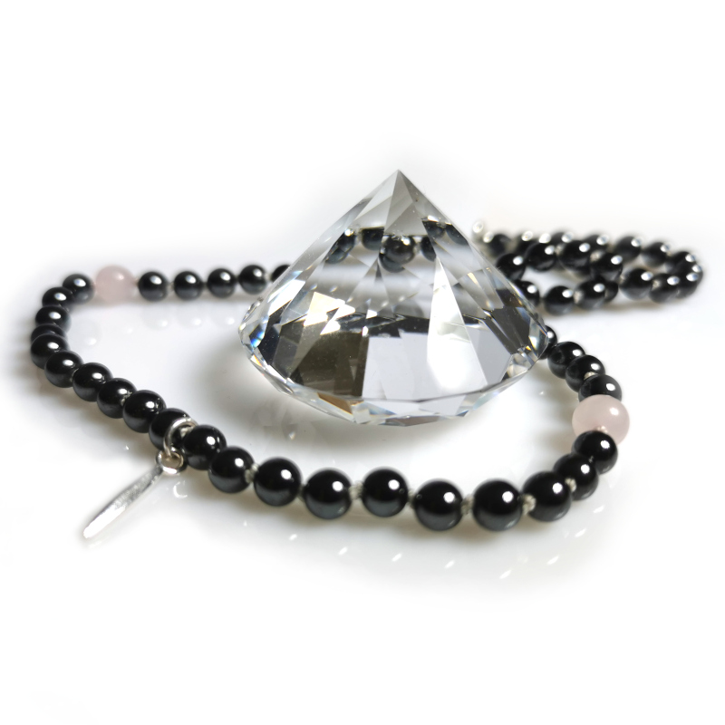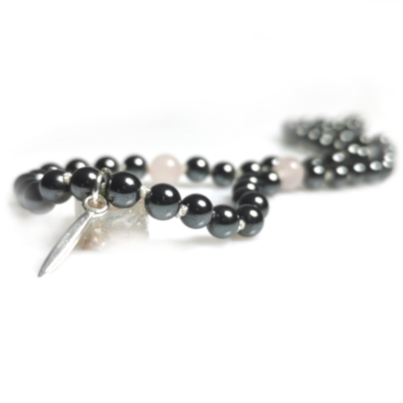 Rosenquarz-Kugeln in 6 mm Größe eingearbeitet. In der Mitte der Kette befindet sich ein Silber Charm (Anhänger aus