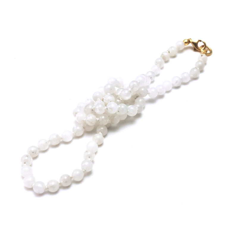 Mondstein. Kugelförmig geschliffene, 4 mm große Steinperlen sind achtsam ausgewählt, von SPHINGS von Hand auf weiße Perlseide geknüpft und mit Abschlussperlen (Ausführungen der Abschlussperlen können vom Symbolbild abweichen) und Verschlüssen (Karabiner und Bindering) aus