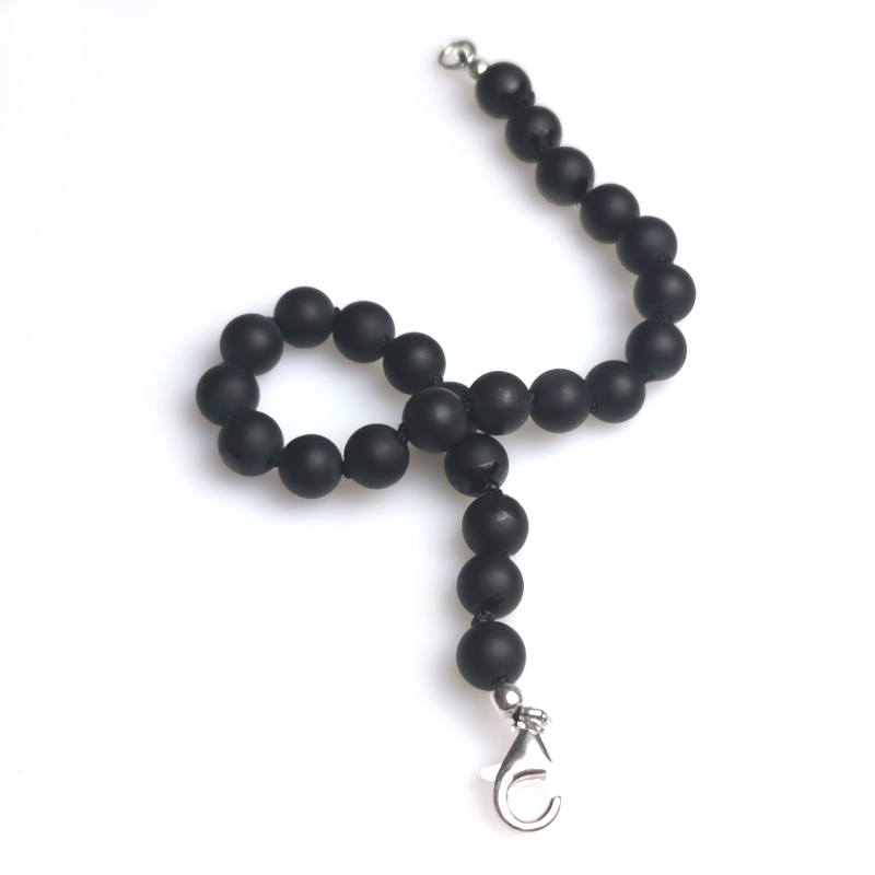 Onyx mit dem Durchmesser von etwa 6 mm werden auf schwarze Perlseide geknüpft.