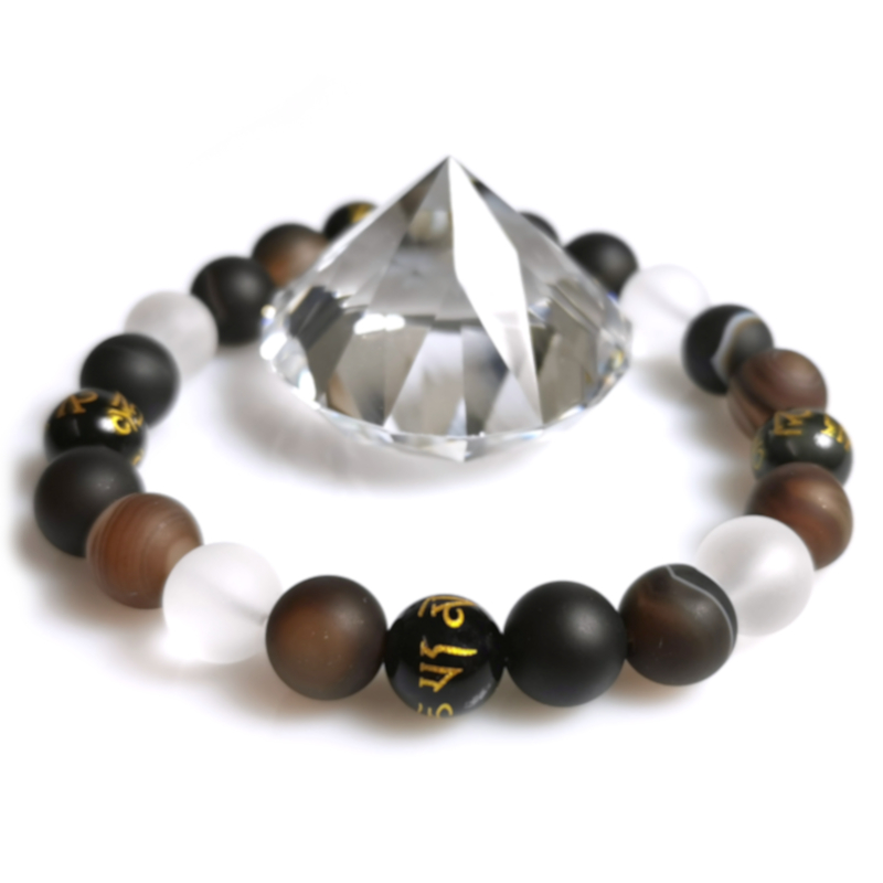 Dieses von SPHINGS in Handarbeit erstellte Edelstein Armband OM MANI PADME HUM kombiniert in einem zeitlosen Design elegante, mit einem geschnitzten goldenen Om Mani Padme Hum-Zeichen versehene Obsidian-Kugeln mit klassischen mattierten natürlichen Edelsteinen bzw. Schmucksteinen. Om Mani Padme Hum (sinngemäß "Oh du Juwel in der Lotusblüte") ist ein buddhistisches, universelles Mantra der Liebe und des Mitgefühls. Kugelförmig geschliffene 10 mm große Kugeln aus mattiertem